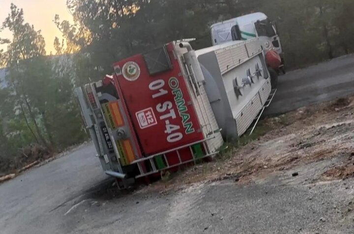 Adana'nın Kozan ilçesinde çıkan orman yangını grupların müdahalesiyle söndürülürken, dönen bir su tankeri devrildi....