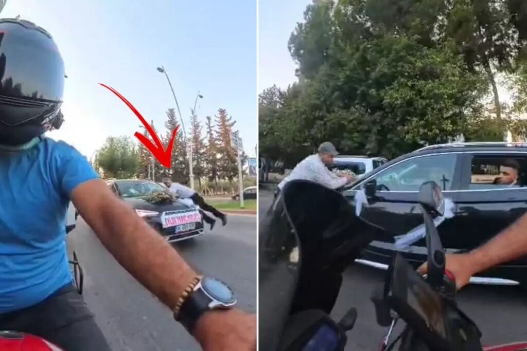 Adana’da düğün konvoyunu gören bir kişi, gelin arabasından bahşiş almak için yaklaşık 150 metre koşarak kaputa atlayıp bir müddet seyahat yaparken, para aldıktan sonra uzaklaştı.