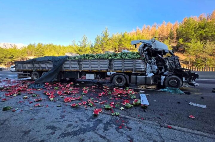 Adana-Pozantı otoyolunda bir karpuz yüklü tır, öteki bir tıra geriden çarparak devrildi. Kaza sonrası...